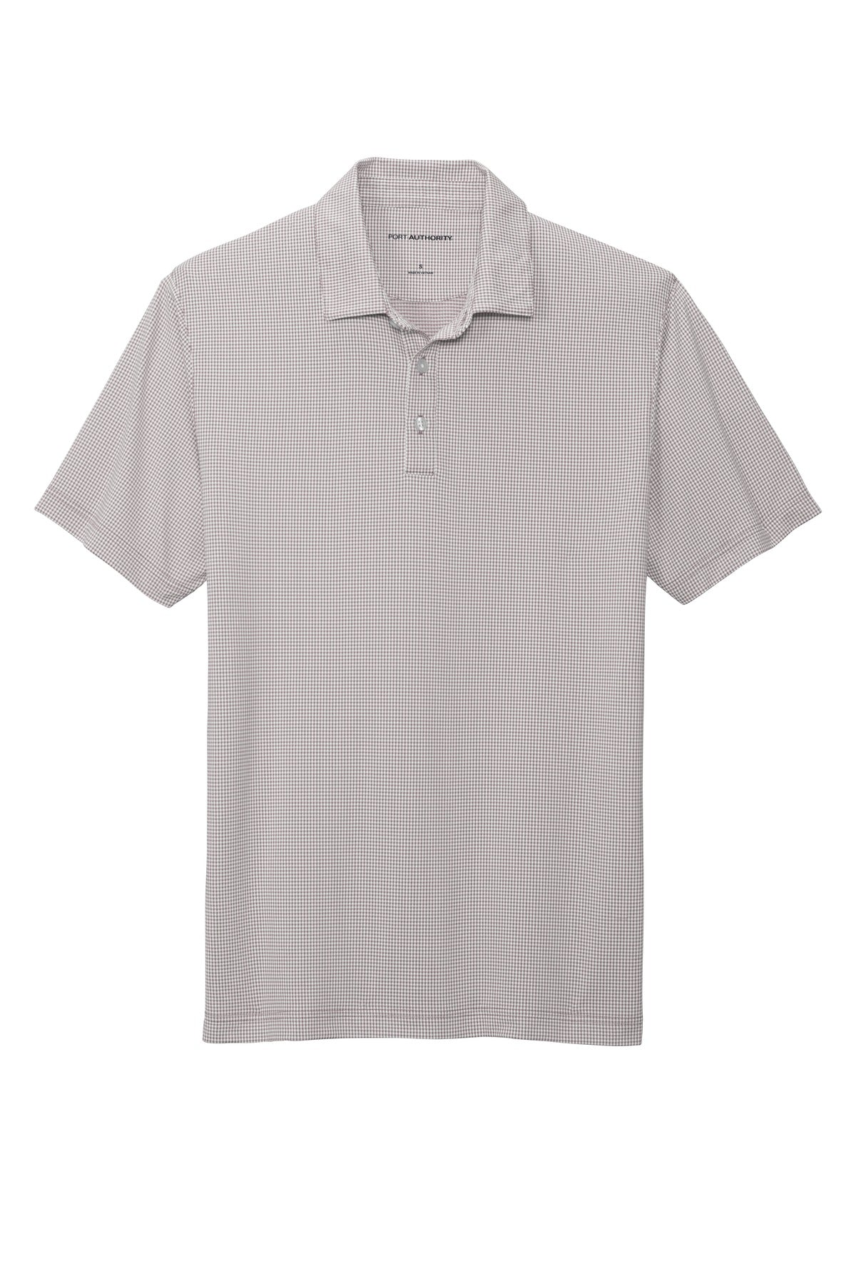 For a corporate or casual look that is both fashionable and functional these polos have a unique micro-check gingham pattern and release soil wick moisture and resist snags. 4.4-ounce 90/10 poly/spandex Soil release Moisture-wicking Snag-resistant Self-fabric collar with collar stand 3-button placket Side vents